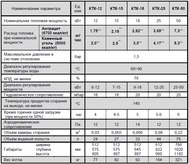 — Антрацит: теплота сгорания – 6700÷8000 ккал/кг, влажность — 4÷5 %, зольность — ≤ 25%, выход горючих летучих веществ — ≤ 9%. Преимущества: большое содержание углерода до 95%, горит при сильной тяге без пламени, без запаха и дыма; большая теплота сгорания, что увеличивает интервал закладки новой порции топлива; не спекается. Недостатки – плохо воспламеняется.