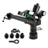 Дождеватель импульсный на 2 форсунки Presto-PS (6011) используется для орошения (полива) участков большой площади, для полива одного гектара земли их достаточно установить 4-6 штук в зависимости от формы участка. Оптимально подойдут для газонов или футбольных полей. В отличии от других видов эти дождеватели подают воду короткими импульсами с небольшим временным интервалом, встроенный маятниковый механизм разбивает струю на части и создает эффект близкий к естественному дождю. Данная модель универсальна в использовании на участках разной формы благодаря возможности регулировки сектора полива от 10 до 360°. Возможно подключение как к гибкому садовому шлангу с установкой на переносную треногу, так и стационарная установка на магистральную трубу с помощью фитингов с наружной резьбой 40 мм (1,1/2"). Рекомендуемое рабочее давление в системе от 3 до 5 атмосфер. Модель комплектуется четырьмя дополнительными форсунками для формирования струи различного диаметра, пятая насадка используется для получения плоской формы струи. Изготовлен дождеватель из высококачественного, стойкого к воздействию ультрафиолетового излучения и удобрений пластика. При производстве используются только первичные высококачественные материалы.
